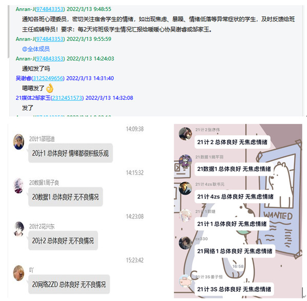 围绕现有的“心理健康教育服务中心—辅导员、班主任—班级心理委员-宿舍”四级网络体系,加强“宿舍”第一道防线,充分发挥暖暖心协、班委、心理委员、宿舍长等心理团队的作用,密切关注班级学生心理动态,及时反馈学生心理健康问题。