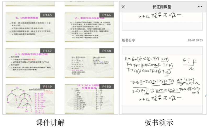 课中:利用“长江雨课堂+QQ群”组合方式进行直播教学,通过分享屏幕讲解PPT课件,并结合雨课堂的电子板书随堂手写板书,引导学生对重点知识进行深入分析和演示。