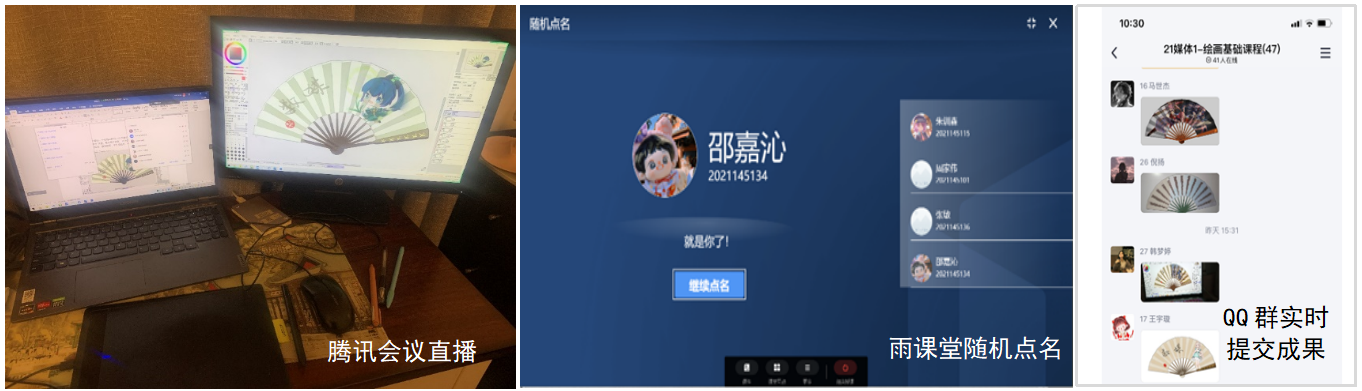 直播课堂中,史航老师充分运用“腾讯会议+泛雅课堂+雨课堂+QQ群”多平台互动学习的学习模式开展了丰富的教学活动。通过腾讯会议分享屏幕方式,一方面实时演示绘画的步骤和过程,另一方面与学生进行实时沟通与交流,回答和解决学生的各类问题,使学生清晰明了地掌握了绘画基础课程的重点与难点;通过雨课堂教学工具,对学生进行随机点名和提问互动;通过QQ群,让学生将绘画内容截图发到课程QQ群中,及时了解学生实验过程和结果。