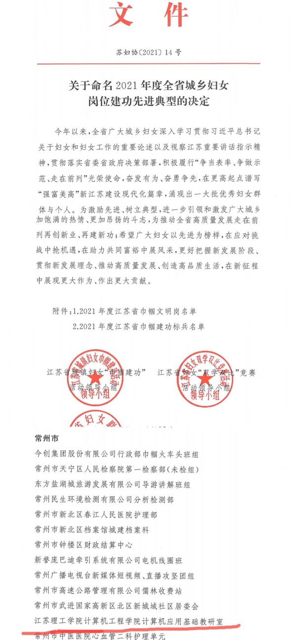 近日获悉:世界杯(中国)计算机应用基础教研室被授予为2021年度江苏省“巾帼文明岗”。
