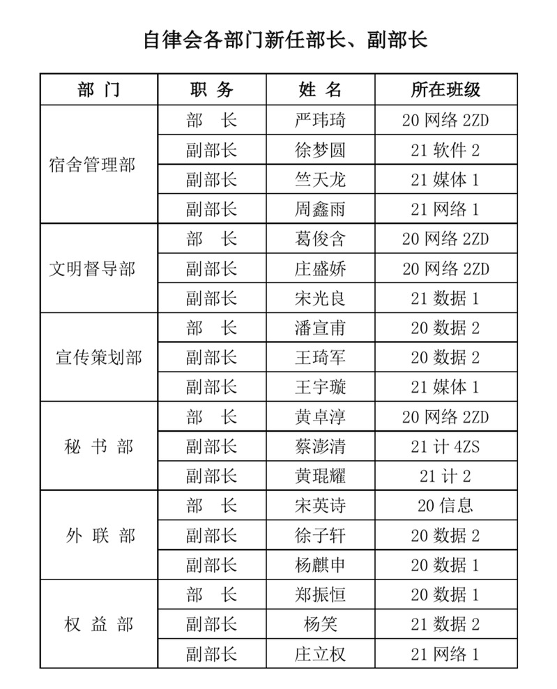 经严格、公正面试,结合应聘者的工作能力和工作表现进行综合考察,拟聘任以下同学担任自律会各部门的部长、副部长。