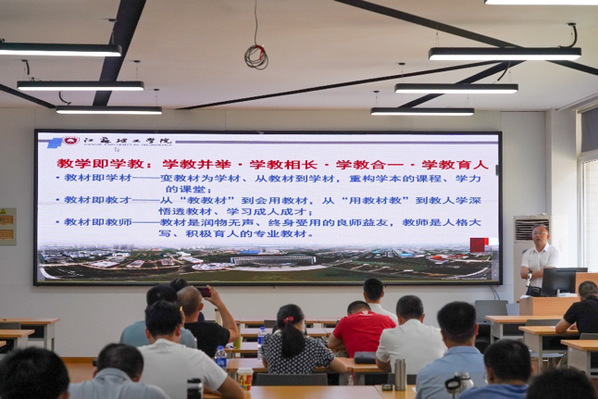 开班仪式后,江苏理工学院党委副书记、校长崔景贵教授做了《为积极而教 与积极同行——做积极职业教育的先行者漫谈》专题讲座。讲座围绕为“积极而教:现代职业教育的时代意蕴”和“与积极同行:追求专业的实践策略”两部分内容,为高职院校骨干培训教师指明了做专业卓越的大学教师,成为新时代“积极职业教育实践者”的基本路径和行动方向。(图:高伟 文:郭丹、薛小锋 审核:谢芳)