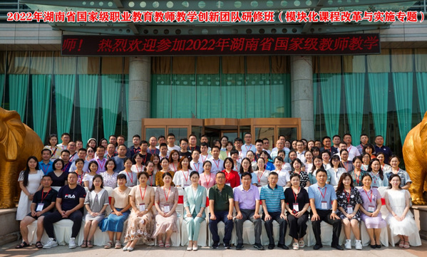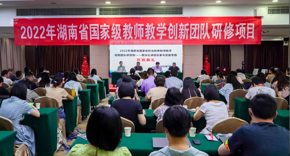 2022年7月26日上午,湖南省国家级教师教学创新团队研修模块化课程改革与实施专题项目培训在我校举行,校党委常委、副校长贝绍轶,继续教育学院院长、全国重点建设职教师资培训基地办公室主任陈胜权,计算机工程学院党委书记谢芳,项目负责人、班主任及100名湖南省国家级教师教学创新团队的负责人和骨干教师参加了开班仪式。开班仪式由谢芳主持。