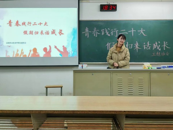 陈子薇老师在22软件1和22数据1的班会上用精彩的短片回顾了党从成立之初到新时代的曲折历程,激发同学们积极向上的斗志。多位同学分享了寒假社会实践活动。陈雨萱同学参加了宣传传统文化的社会实践,通过这次社会实践,更加深入的了解到中华文化的博大精深,并且意识到要增强中华文明的传播力和影响力,传播好中国声音,展现可信可爱可敬的中国形象;胡童城同学参加了基层社区服务,这次社会实践活动以解决居民诉求、查看出租房、走访重点人群、送福字等方式开展,丰富了我的寒假生活,深刻体会到了团结和互助的重要性,也为以后的就业打下了良好的基础。