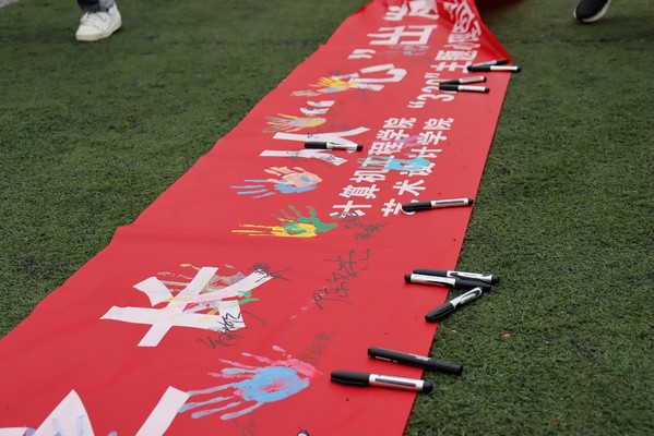 通过“击鼓传球”、“心有千千结”以及“拉绳配对”趣味体育活动中,同学们缔结了友谊,互赠了礼物,并手绘印章装饰横幅,留下活动的印记。