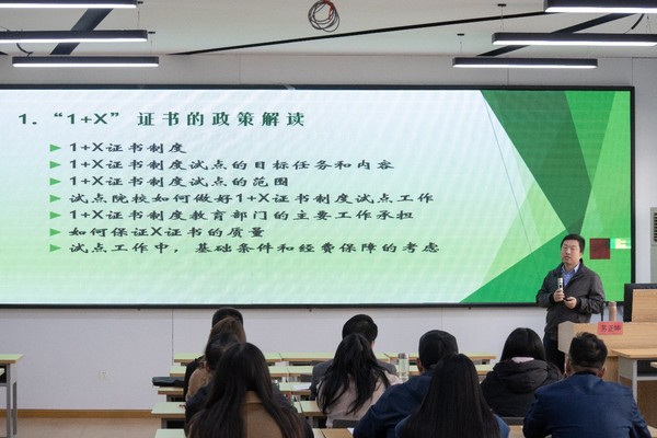 开班仪式后,江苏万和系统工程有限公司负责人苏正坤做了《“1”与“X”有机衔接与“课证赛岗”融通的基本路径及相关资源体系建设》专题讲座,围绕职业教育1+X证书,课证赛岗等进行了充分的解读。