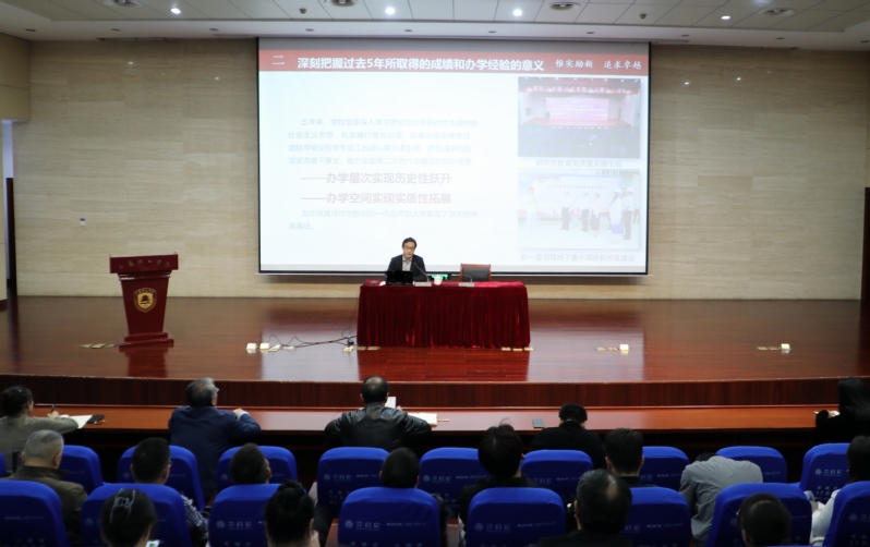 范洪辉围绕学校第三次党代会的主题和主要成果;紧扣学校过去5年所取得成绩和办学经验的重要意义;深刻把握特色鲜明的一流应用型大学内涵与要求;深刻把握新征程学校发展的目标任务、战略导向和发展举措;着力以高质量党建引领学校卓越发展铸就新辉煌;学习体会与工作思考等六个方面对学校第三次党代会进行了系统的回顾,对贯穿始终的“13666”的战略部署等党代会报告蕴藏的数字含义进行了重点解读。
