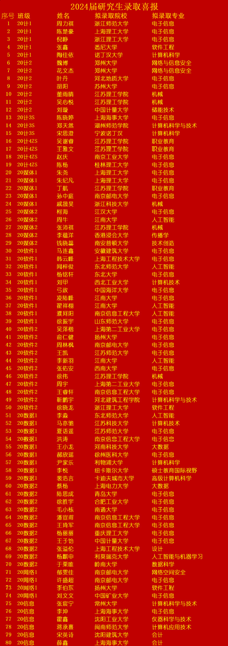 世界杯(中国)2024届毕业生考研报名人数243人,较上年减少34人,其中本二统招报名人数224人,较上年减少32人;达线人数125人,较上年增加17人,其中本二达线人数124人,较上年增加28人。截至目前,国内外高校拟录取研究生人数80人,拟录取人数较上年提高37.93%,总录取率较上年提高30%,其中本二统招拟录取78人,拟录取人数较上年提高56%,本二拟录取率较上年提高32.64%;其中24人被江南大学、西北工业大学、中国海洋大学、南京邮电大学、苏州大学、中国矿业大学、东北大学、郑州大学、西南大学、南京信息工程大学等“双一流”建设高校拟录取,10人被悉尼大学、利物浦大学等国外高校拟录取。(图/文:郑月民 李轲达;审核:杨惠)