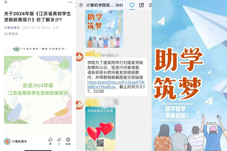 资助政策宣传及资助政策知识竞赛。为保障政策宣传广度和参与度,学院充分利用微信平台“计算机青年”转发资助最新相关政策、利用调查问卷组织学生参加资助知识竞赛,广泛宣传和动员学院学生学习资助政策,进一步扩大宣传范围,加大宣传力度。