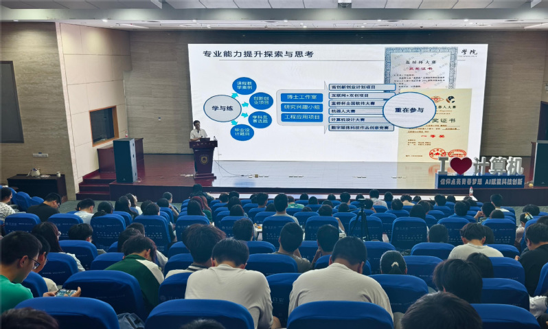 范洪辉作题为《奋发有为 追求卓越 —做有志向的计算机人》的信仰公开课。范校长结合自身的学术研究和教育经验,从新时代背景下专业学习、AI时代智能学习特征、专业能力提升探索思考、新工科背景发展愿景四个方面,为同学们详细解读了Ai时代计算机专业学习的新特征,探讨了人工智能对教和学的影响,强调了爱国精神和人文素养在计算机专业学习和研究中的重要性。他提出“专业能力成长三问”,勉励同学们以自律、求真、务实的态度,不断提升自己的专业能力,追求卓越,追求先进的科技知识,将自己的青春梦融入中华民族伟大复兴的中国梦,成为有志向的计算机青年。