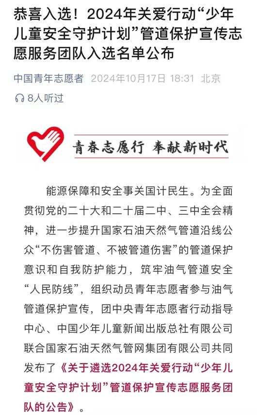 近日,团中央青年志愿者行动指导中心、中国少年儿童新闻出版总社有限公司联合国家石油天然气管网集团有限公司共同发布了《世界杯平台遴选2024年关爱行动“少年儿童安全守护计划”管道保护宣传志愿服务团队的公告》。主办单位对申报材料认真审核,全国共有来自419所高校的1000支团队入选,世界杯(中国)“计往开来”志愿服务队成功入选志愿服务团队名单。