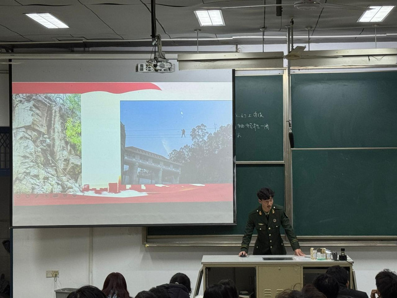 王家楠同学于2021年3月入伍,2023年3月退伍,曾在中国人民解放军火箭军服役。王家楠介绍了兵役登记流程、入伍条件、应征入伍程序,对于自己享受到的优待资助、选用培养、考试升学、就业服务等方面的优惠政策进行了重点介绍。邱月凡同学于2022 年 3 月入伍,2024 年 3 月退伍,曾在中国人民武装警察部队新疆生产建设兵团总队服役。邱月凡回顾了部队生活,介绍了士兵的训练过程、严格纪律,任务执行等部队生活,他号召同学们积极报名参军入伍,在部队大熔炉中拼搏奋斗,书写无悔的青春篇章。